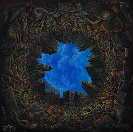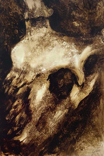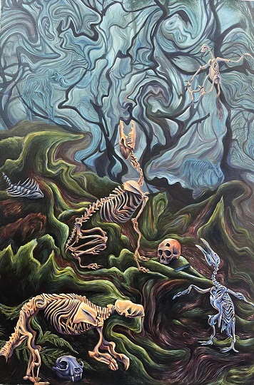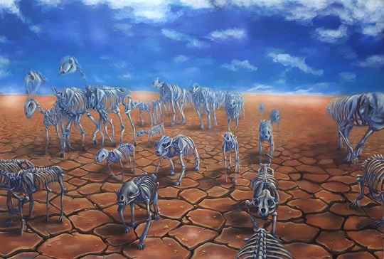 ابتدا تکنیک کارهایم رنگ روغن و اکرولیک روی بوم بود، خطوط سیال و پیچان و شکل دفرمه شده ی اسکلت حیوانات و حالت ذوب شدن طبیعت به نشانه نابودی در کارهای رنگی ام هماهنگی خوبی بین موضوع و نوع برخوردم با رنگ و فرم ایجاد کرد.