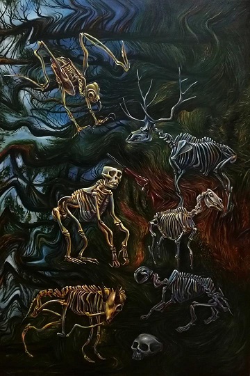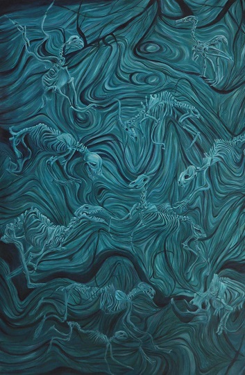 ابتدا تکنیک کارهایم رنگ روغن و اکرولیک روی بوم بود، خطوط سیال و پیچان و شکل دفرمه شده ی اسکلت حیوانات و حالت ذوب شدن طبیعت به نشانه نابودی در کارهای رنگی ام هماهنگی خوبی بین موضوع و نوع برخوردم با رنگ و فرم ایجاد کرد.